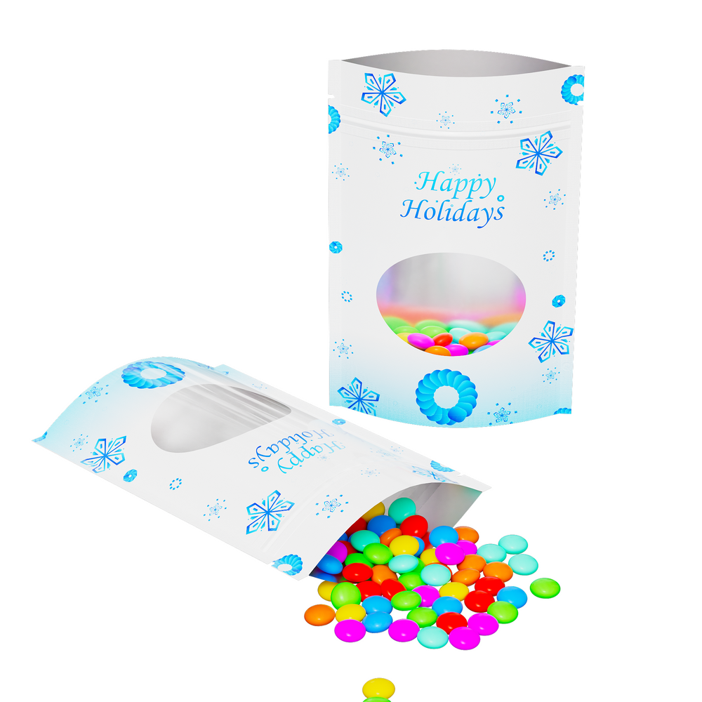 Make your holiday packaging shine with our Glossy Happy Holidays Round Window Plastic and Mylar Stand Strong® Bags. These striking white bags, adorned with a vibrant blue design, effortlessly blend durability with elegance, ensuring your products are presented at their best. Designed to stand upright on their own, these bags not only protect your items but also enhance their visual appeal on store shelves or under the tree. Whether you're packaging gourmet treats, handcrafted goods, or festive gifts, these bags add a touch of holiday cheer that captivates and entices. Show your customers you care about quality and style—choose the bags that make a statement this season.
