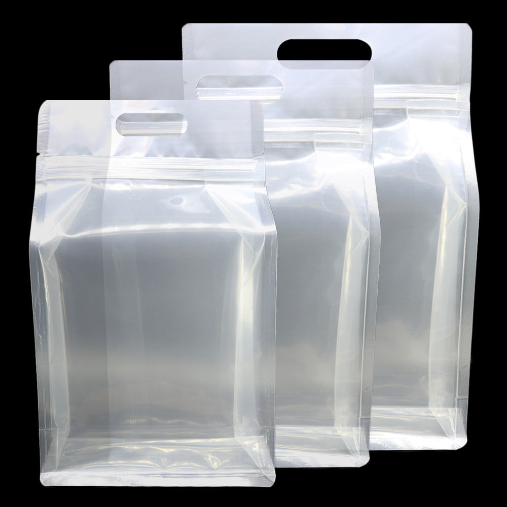 For large quantities and heavy objects, you need to try out these poly-plastic Stand Strong® bags with die-cut handles. The bags benefit from a zipper seal opening and the option to heat seal for added protection. Two tear notches make the packaging bag simple to open. These bags are composed of a 4.7 mils thick, clear polyethylene. This thick material and the side gussets make these bags capable of being filled to the brim. The flat bottom lets them stand on their own once filled. With a variety of sizes, the needs of your company are sure to be met.