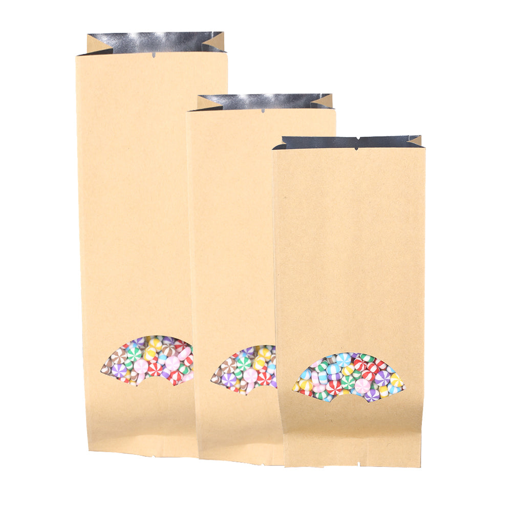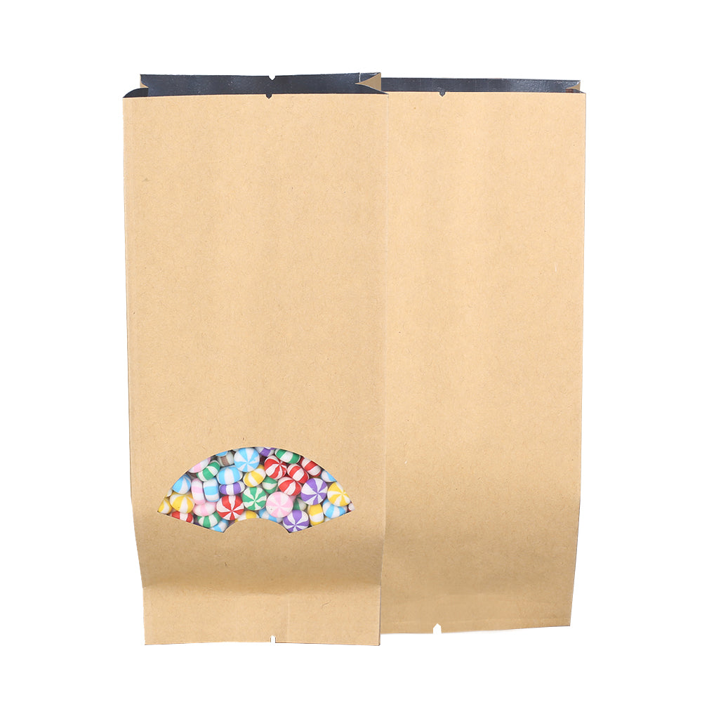 Introducing the latest innovation from Krafty Brown, the Arch Window & Inner Mylar Block Bottom Open Top Bags with Side Gusset! With a sleek and modern design, these bags are perfect for storing and displaying your products in a professional and eye-catching manner. Our team at Krafty Brown has carefully crafted these bags to provide you with the perfect packaging solution, combining functionality and style.