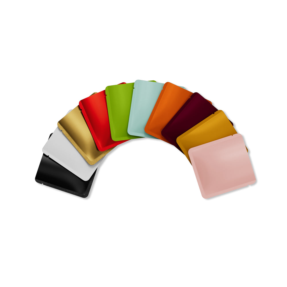 A unique and stylish way to store and carry your items. This square bag is designed from matte aluminum with a rounded corner, making it look sleek and modern. It's equipped with a tear notch for easy opening after being heat sealed. Its smooth finish gives it an extra touch of shine, so you can always be seen in style.