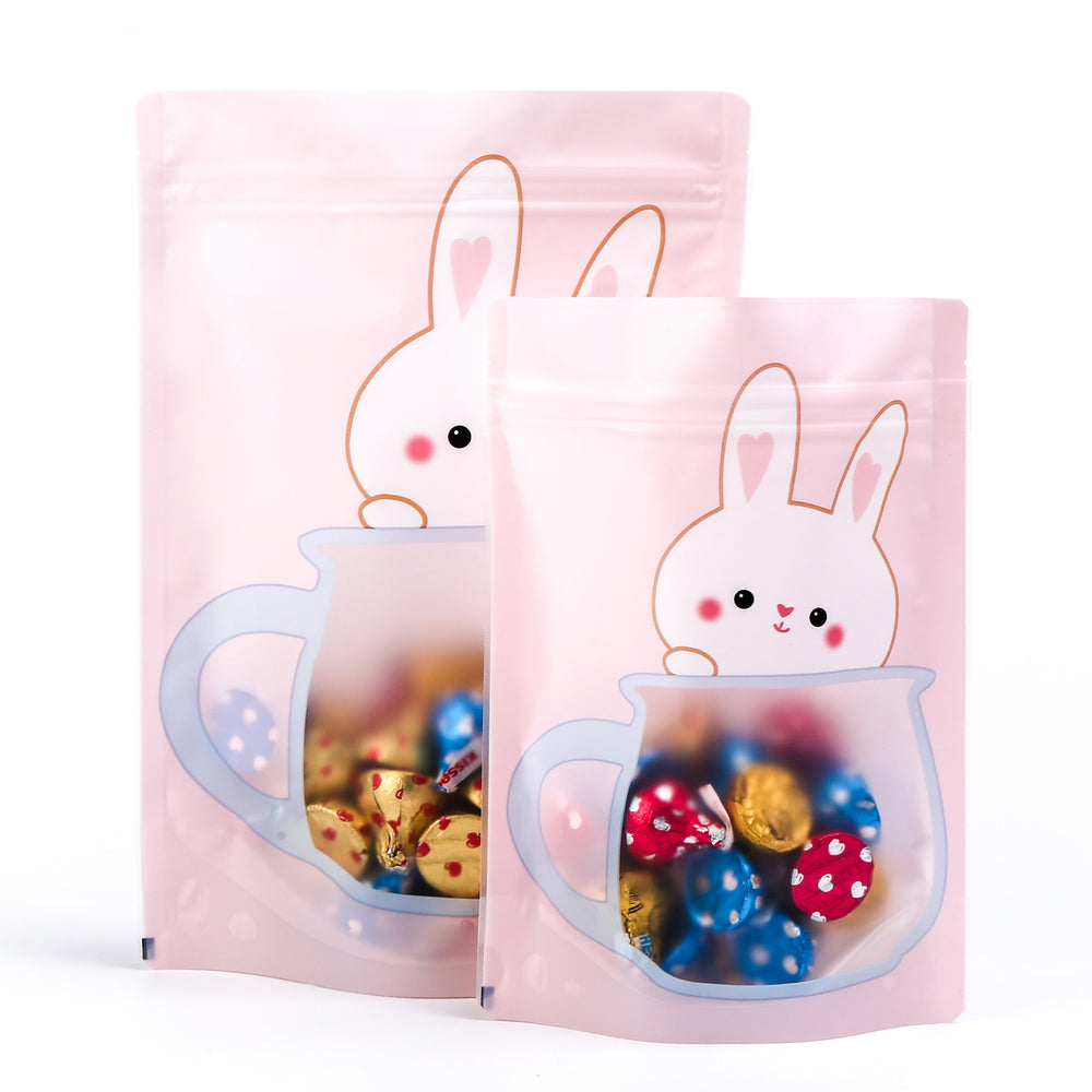Did some bunny ask for an extra cute packaging bag? It doesn’t matter, because we made one anyway! These charming pink pouches feature a smiling little rabbit peeking out of a blue mug. Their white fur really pops against the pastel pink background. The mug has a translucent window on it, which shows off the stored products. Draw in attention with the cute bunny, and direct it towards your products with the translucent window. The bottom gusset increases the internal capacity and lets the bags stand up on flat surfaces. The heat sealing zipper seal on the top of the bags protects the stored contents of the bag from being damaged by outside elements. Hop on this deal now before these bags are gone!