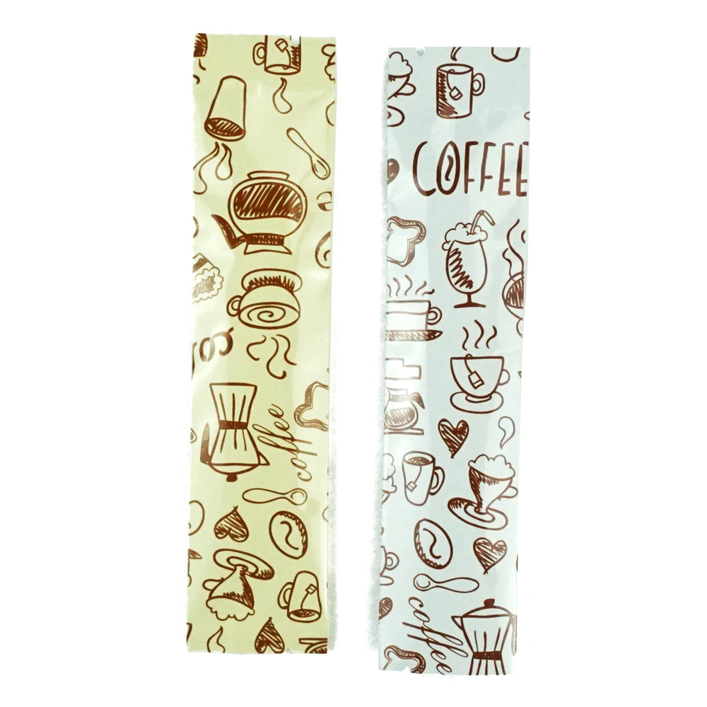 You have found an excellent storage solution for your instant coffee and single-serving coffee ingredients. These foil stick pouches are instantly recognizable thanks to the fun pattern printed all over the pouches. This design features an assortment of coffee-related icons ranging from desserts and pastries to coffee tools and accessories. Various coffee-related phrases are also printed across the bags in a range of font styles. These smell-proof and moisture-resistant bags are the missing half that your products need!