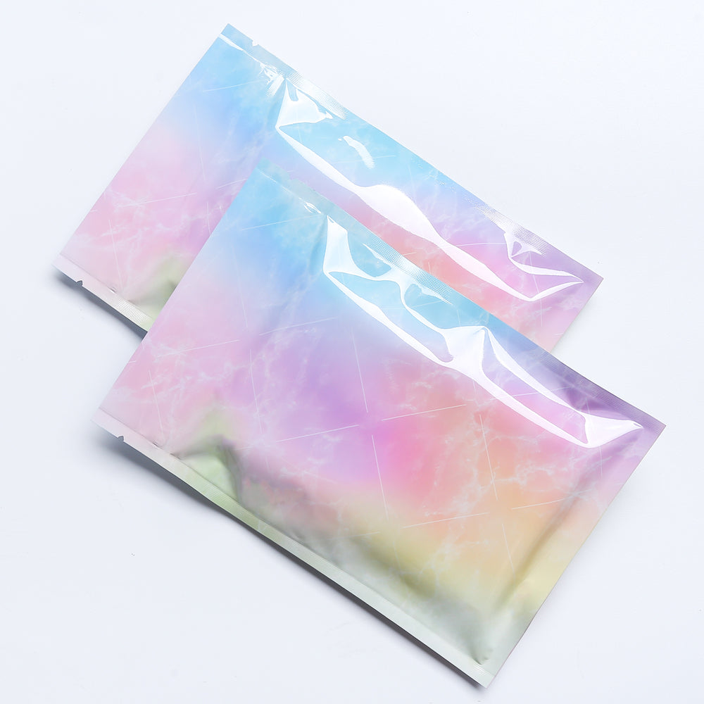 Looking to add unbeatable style to your cosmetic packaging? Try out our new rainbow marble QuickQlick® packaging bags. These flat double-sided bags have a captivating marble rainbow pattern with a light and airy spread of colors. The spectrum of different colors is enhanced by the bags' glossy finish. These glossy bags will flash and reflect light to tantalize your customers as they view the bags. Start storing beauty products in beautiful packaging.