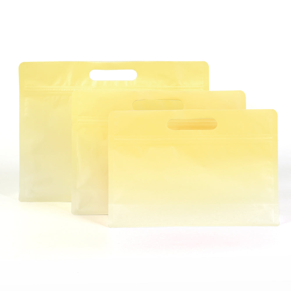 It’s a new day, start it off right with these Sunrise Yellow Stand Strong® bags. These colorful gradient packaging bags feature a bold blend of colors that emit a sunny and joyful personality. The yellow color begins at the top of the pouch and then fades to white as your eyes descend the pouch. This mix of yellow and white results in a bright presentation. The clear side gussets allow the viewers to see inside of the bag, so the attention drawn from the colors can be directed towards your stored products. The die-cut handle and durable bottom gusset, paired with the reliable zipper seal add to an overall premium packaging experience.